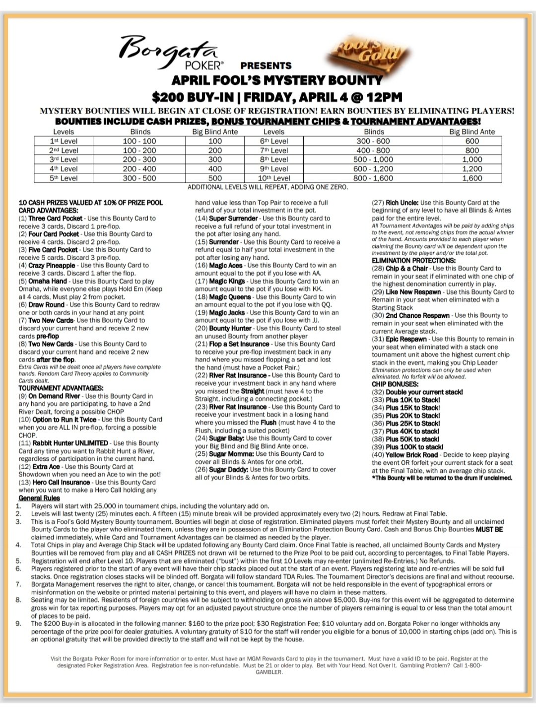 Το Borgata poker room αποφάσισε να πρωτοτυπήσει με την ανακοίνωση του April Fool’s Gold Mystery Bounty, το οποίο περιλαμβάνει βραβεία-έκπληξη όπως η δυνατότητα απευθείας πρόκρισης στο τελικό τραπέζι και διάφορους τρόπους… διάσωσης από τον αποκλεισμό.