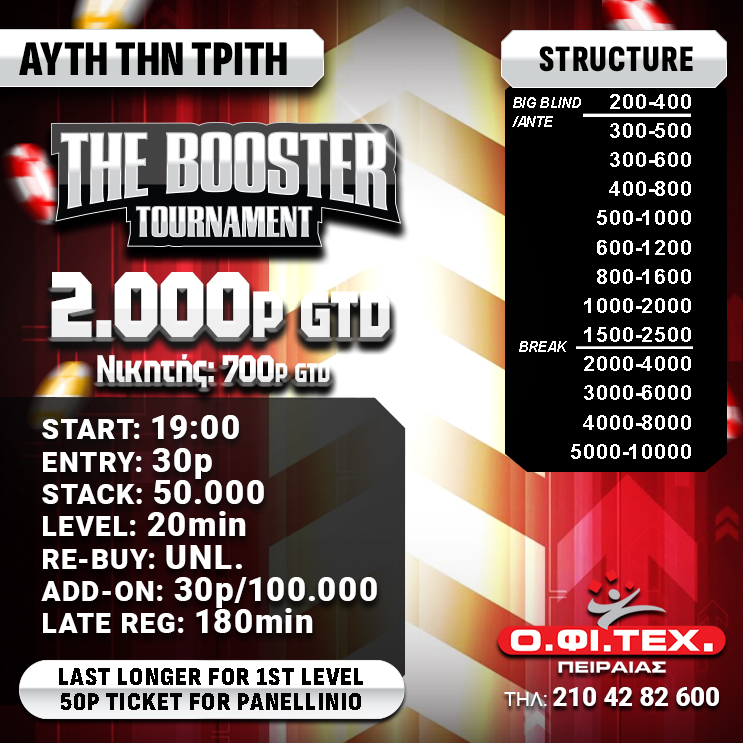 Καθυστερημένες εγγραφές και δικαίωμα για απεριόριστα rebuys (10p/20.000) τα πρώτα 180 λεπτά