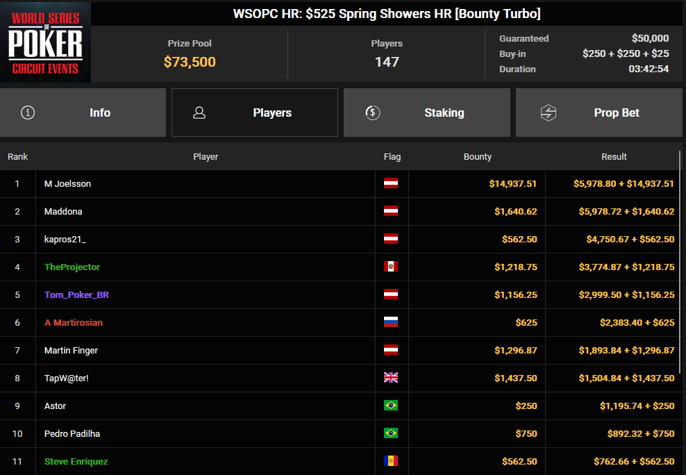 Δύο σκορ για τον Μάριο “kapros21_” Καπίρη που τερμάτισε στην 3η θέση του $525 Spring Showers για $5.314 και στην 5η θέση του $125 Spring Marathon για ακόμη $5.127.
