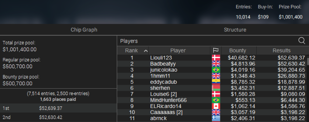 Στην 11η θέση του διήμερου $109 Sunday Million αποκλείστηκε ο “abrnck” εξασφαλίζοντας $5.604.