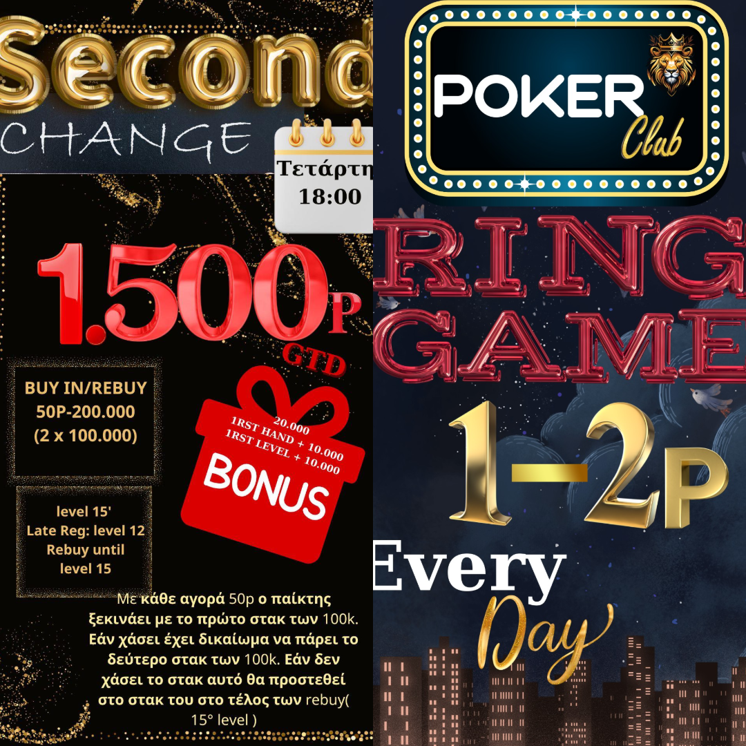 Το Second Chance επιστρέφει στις 18:00 στο King με διπλό stack (200.000), διπλό bonus (20.000) και 1.500p gtd, ενώ θα τρέξουν και 1p/2p ring games από τις 20:30.