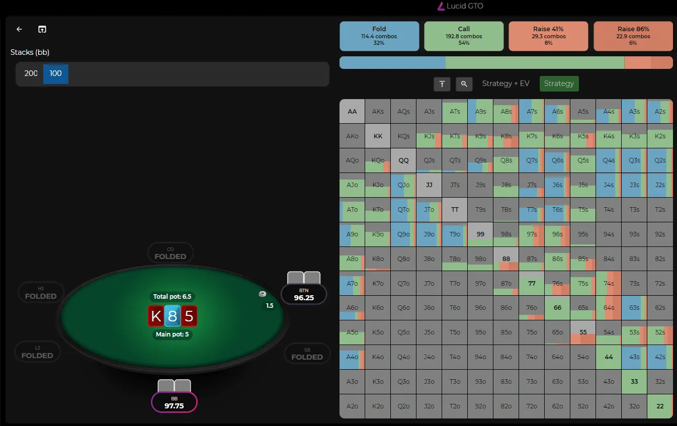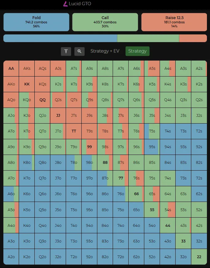 Για να δείτε πως μοιάζει ένα καλό range άμυνας, ακολουθεί το Lucid Poker που παρουσιάζει το βέλτιστο defending range του BB απέναντι σε ένα button (BTN) open-raise στα 2.5BB.