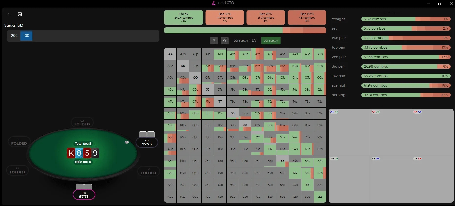 Επιπλέον, ο solver εξακολουθεί να κάνει slowplay ορισμένα monsters – sets, two-pairs και δυνατά semi-bluffs – κάνοντας το check-calling range του εξίσου δύσκολο να εκμεταλλευτείτε.