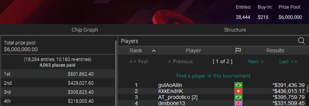 Το τουρνουά συγκέντρωσε τελικά 28.444 συμμετοχές με τον “gutAoAllin” να κερδίζει $391.436! Είχε προηγηθεί deal με τους υπόλοιπους τρεις φιναλίστ.