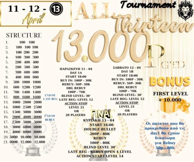 Στους 100p η είσοδος, στους 50p/100p τα rebuys, 30λεπτα τα levels και ανοικτό το late reg για τα πρώτα 12 ημίωρα levels!