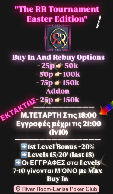 To πασχαλινό πρόγραμμα στο River room poker club της Λάρισας φέρνει εκτάκτως σήμερα το RR tour!