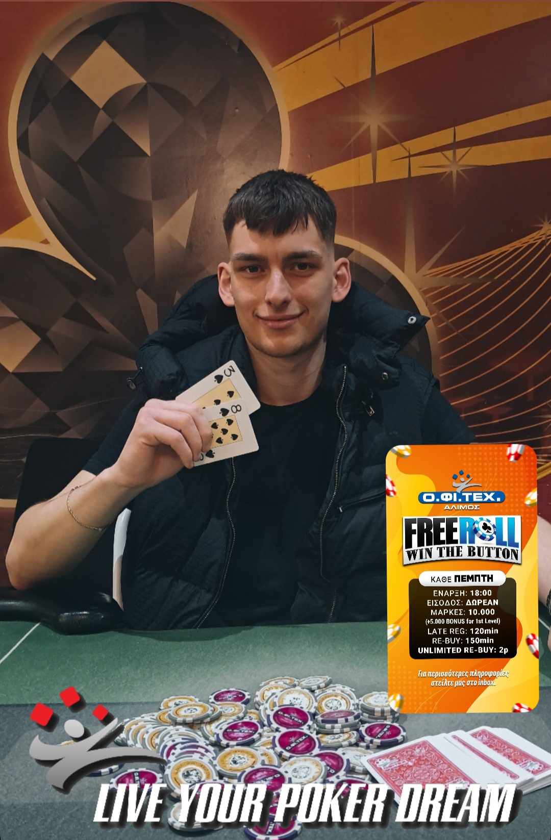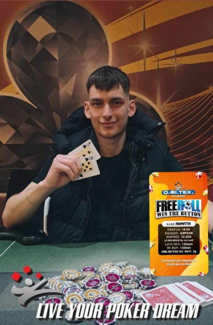 Στο Omaha Button Choice του Πειραιά (21e/30r/3a) Νίκος Δερβένης (670p) και Παναγιώτης Τροχαλίδης (400p) έφτασαν στο heads-up, ενώ ο Καναδός (φωτο) κέρδισε το freeroll (22e/120r) του Αλίμου.