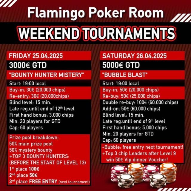 Aκόμη ένα διήμερο με live τουρνουά και 8.000 ευρώ εγγυημένα έρχεται στο Flamingo poker room που βρίσκεται αμέσως μετά τον συνοριακό σταθμό των Ευζώνων!