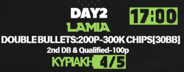 Η Day 2 αρχίζει στις 17:00 στο Queens της Λαμίας με blinds 5k/10k, δικαίωμα για double bullet (200p – 300.000) και το δεύτερο db (ή για όσους έχουν προκριθεί) προς 100p (300.000).