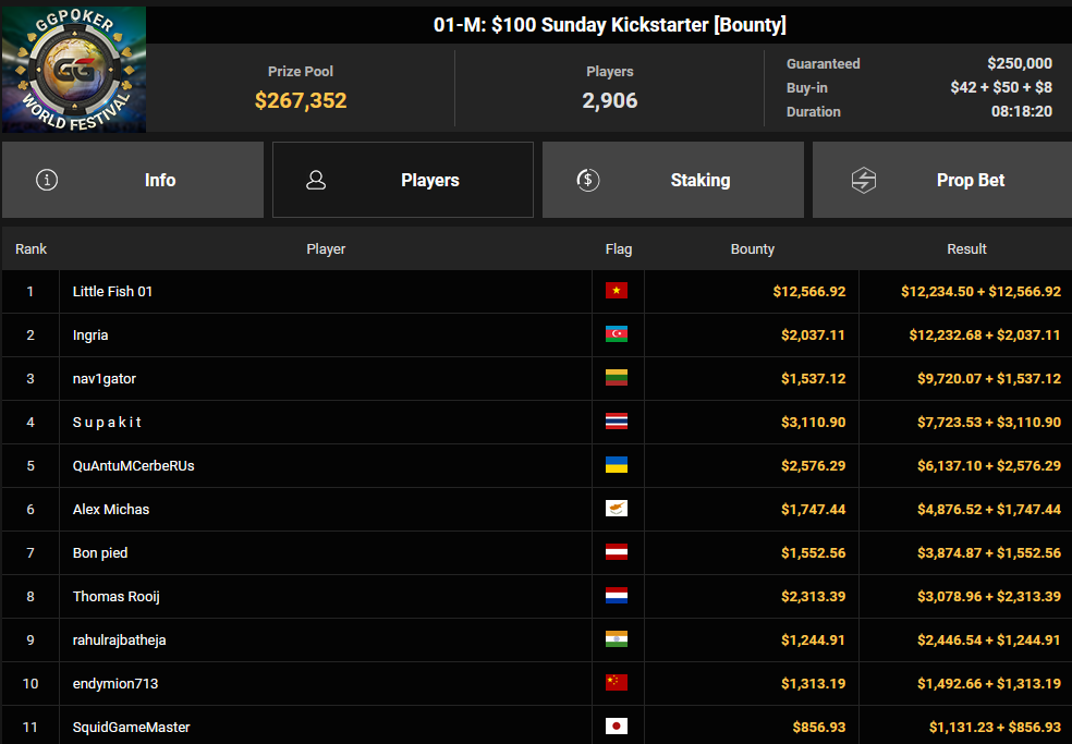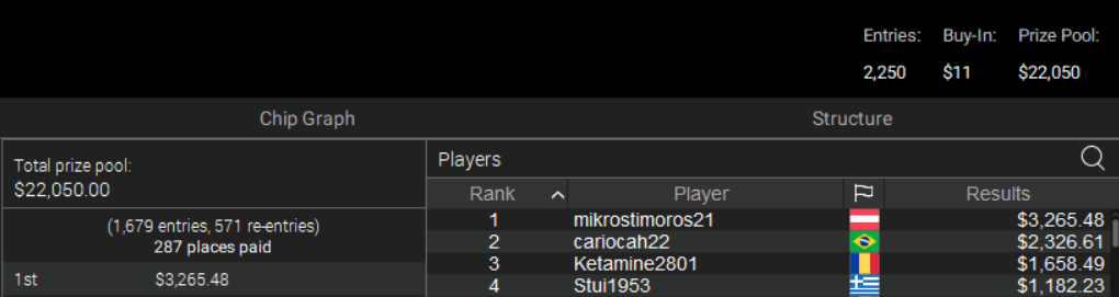 Δύο Έλληνες παίκτες βρέθηκαν στο final table του $11 Mini Kickoff με τον “mikrostimoros21” να φτάνει στην κορυφή για $3.265 και τον “Stui1953” στην 4η θέση για $1.182.