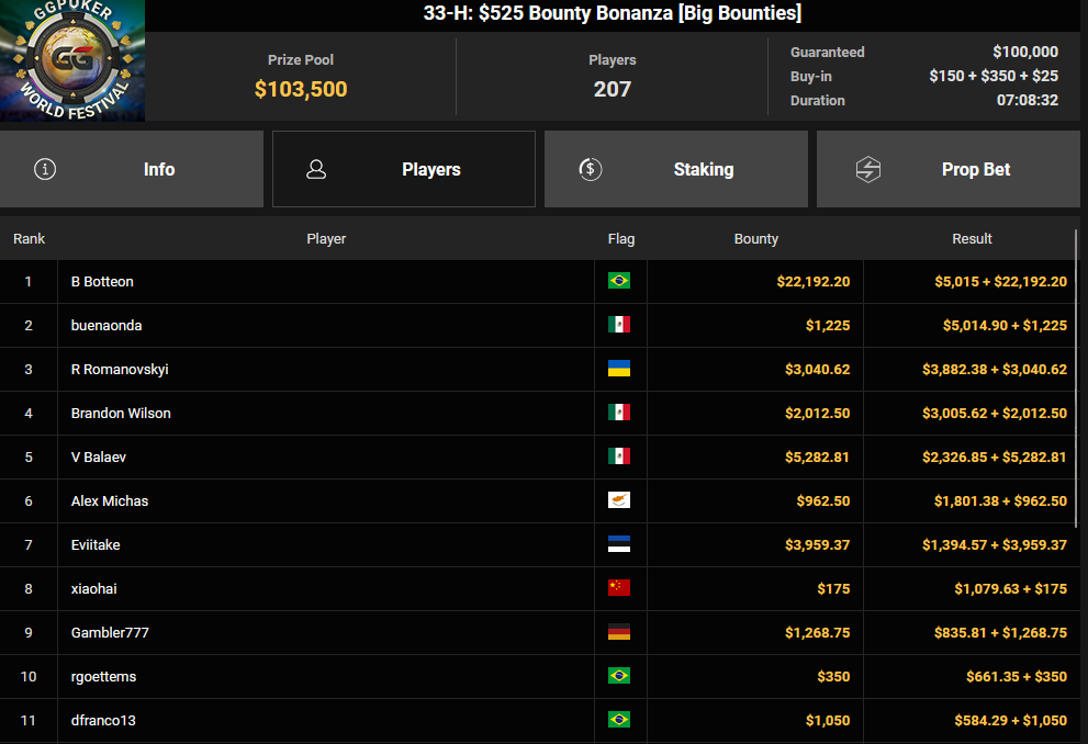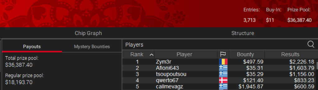 Tρεις Έλληνες παίκτες βρέθηκαν στο τελικό τραπέζι του $11 Mystery Bounty με τον “Afioni643” να τερματίζει στην 2η θέση για $1.639, τον “tsoupoutsou” στην 3η θέση για $1.191 και τον “callmevagz” στην 5η θέση για $2.547.