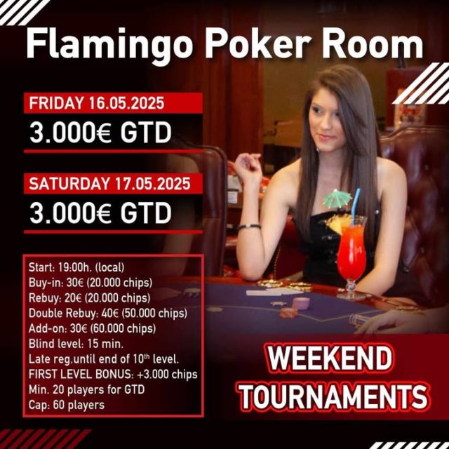 Aκόμη ένα διήμερο με live τουρνουά και 6.000 ευρώ εγγυημένα έρχεται στο Flamingo poker room που βρίσκεται αμέσως μετά τον συνοριακό σταθμό των Ευζώνων!