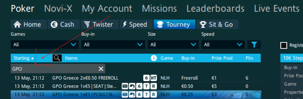 Πατώντας στο φακό αναζήτησης στο κεντρικό lobby της Novibet Poker (Poker > Tourney) και γράφοντας GPO σας εμφανίζονται όλα τα satellites (step stats, seat only, packages).