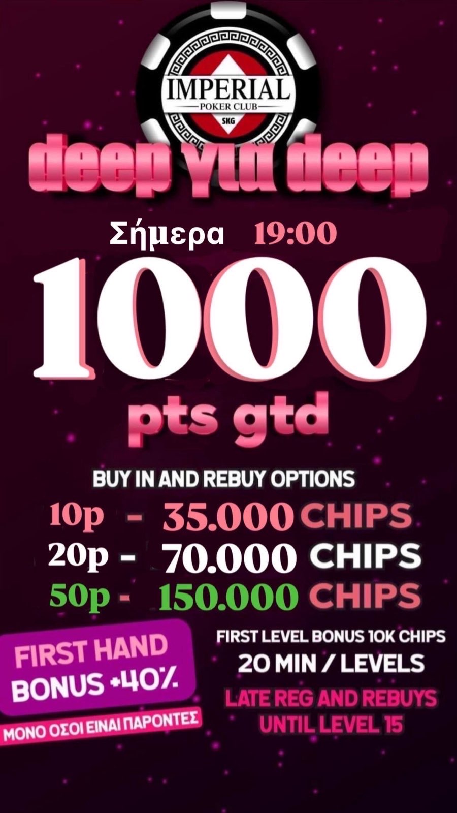 Ιmperial: 7.485p και deal για τέσσερις χθες, deepstack με 1.000p gtd στις 19:00
