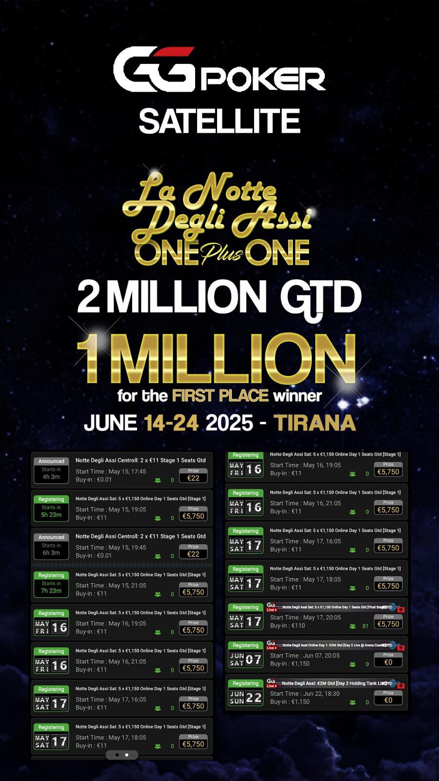 Το φεστιβάλ πόκερ «La Notte Degli Assi – ONE Plus ONE» θα πραγματοποιηθεί από τις 14 έως τις 24 Ιουνίου 2025 στο πολυτελές Arena Casino στην Τίρανα της Αλβανίας. Με εγγυημένο έπαθλο €2.000.000, εκ των οποίων €1.000.000 θα απονεμηθούν στον νικητή του main event, το φεστιβάλ υπόσχεται να προσφέρει μια αξέχαστη εμπειρία στους συμμετέχοντες.