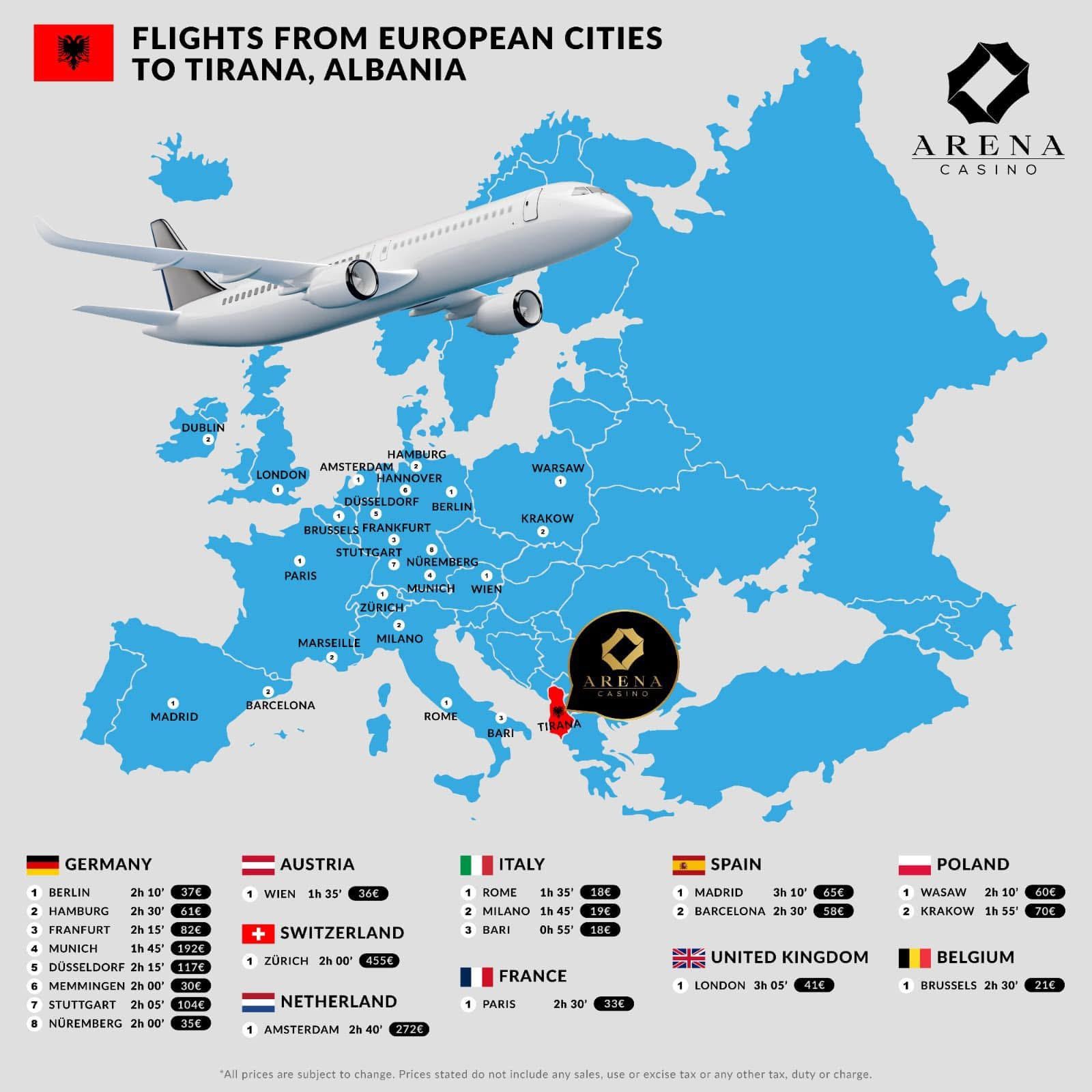 Το Arena Casino, που βρίσκεται στους πρόποδες του γραφικού Όρους Dajti, καθιερώνεται γρήγορα ως κορυφαίος προορισμός πόκερ στην Ευρώπη. Με παγκόσμιας κλάσης φιλοξενία, ζωντανή νυχτερινή ζωή και μια ακμάζουσα σκηνή πόκερ, τα Τίρανα είναι η ιδανική πόλη για να φιλοξενήσει αυτό το σημαντικό γεγονός.