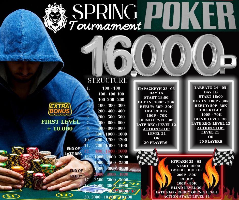 Η δράση αρχίζει στις 16:00 με blinds 1.000/2.500, ante 2.500 και υπάρχει δικαίωμα για double bullet και rebuys στα πρώτα 4 ημίωρα levels.