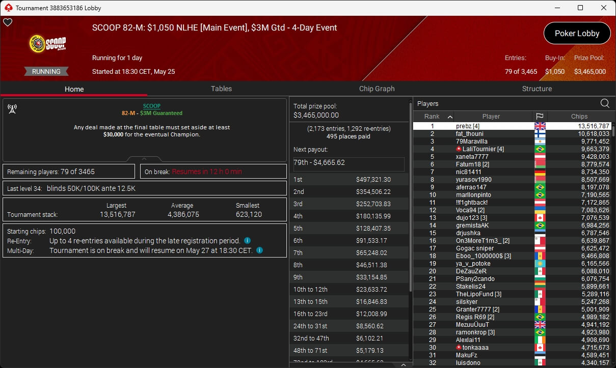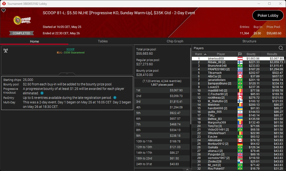 Στην 4η θέση του SCOOP 81-L ($5.5 NLHE PKO) αποκλείστηκε ο “FRAPES1983” εξασφαλίζοντας $1.481.