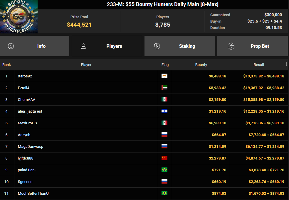 Το σκορ της ημέρας πέτυχε ο “Xaros92“ που κατέκτησε την κορυφή του $55 Bounty Hunters για $27.862!
