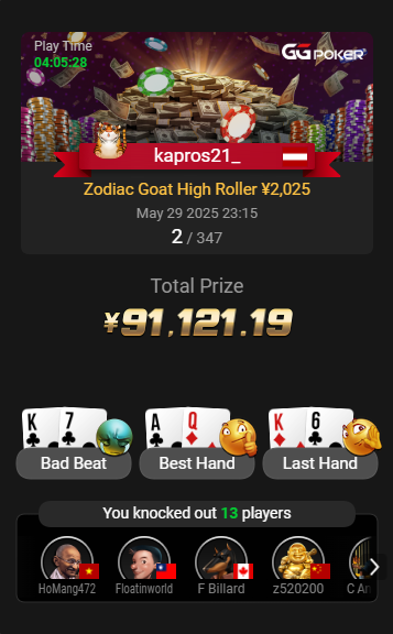 Δύο σκορ ξεχώρισαν στο χθεσινό session του Μάριου “kapros21_” Καπίρη που ηττήθηκε στο heads-up του Zodiac High Roller για $12.700 και τερμάτισε στην 4η θέση του $100 Golden Coast για $4.290!
