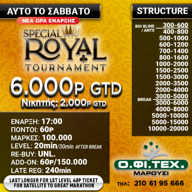 Blind levels: 20 λεπτά / 30 λεπτά μετά το break