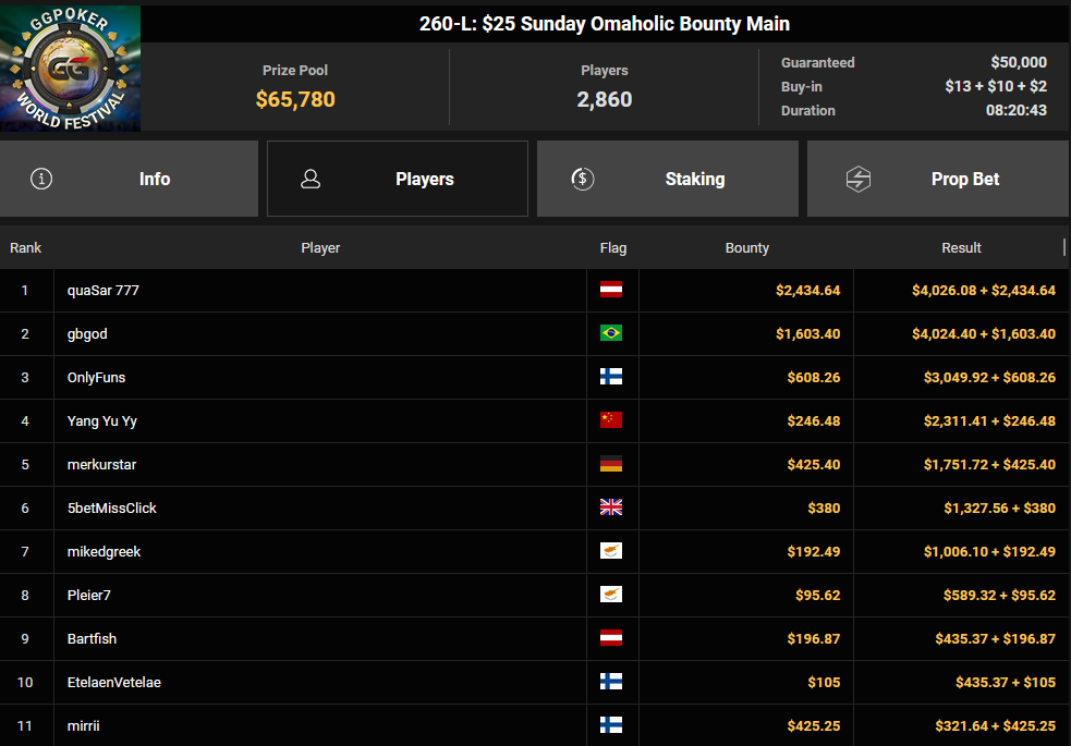 Στην 7η θέση του $25 Sunday Omaholic αποχώρησε τέλος ο “mikedgreek” για $1.199.