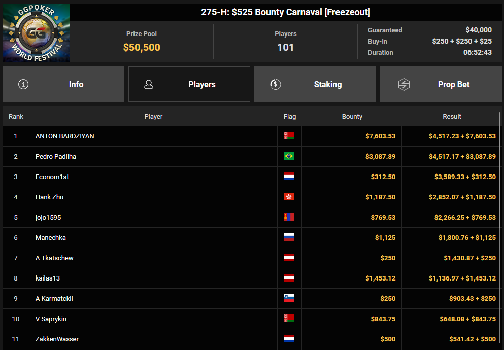 Στην 8η θέση του $525 Βοunty Carnaval αποχώρησε ο “kailas13” εξασφαλίζοντας $2.590.