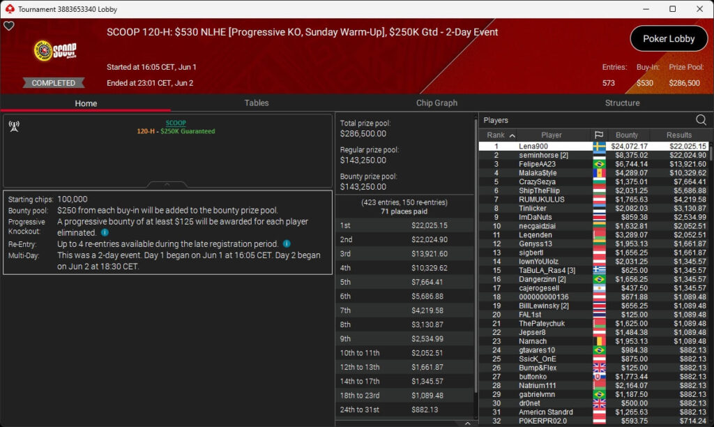 Στην 15η θέση του SCOOP 120-H ($530 NLHE PKO) τερμάτισε τέλος ο “TaBuLA_Rasa4” για $1.971.