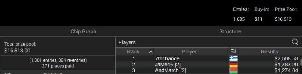 Στην κορυφή του $11 Mini Fenomeno βρέθηκε ο “7thchance” προσθέτοντας στον λογαριασμό του $2.509.