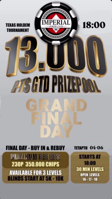 Το ραντεβού των παικτών απόψε για τη final day στις 18:00 με δικαίωμα για platinum bullets (230p – 350.000) και rebuys μέχρι το Level 18.