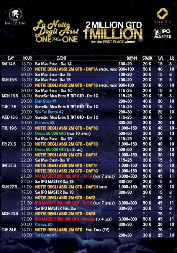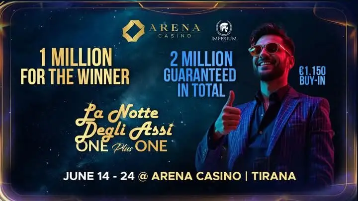 Το φεστιβάλ πόκερ La Notte Degli Assi – ONE Plus ONE έρχεται στα Τίρανα από τις 14 έως τις 24 Ιουνίου 2025, με εγγυημένο συνολικό έπαθλο €2.000.000, εκ των οποίων €1.000.000 θα δοθούν στο νικητή του main event!