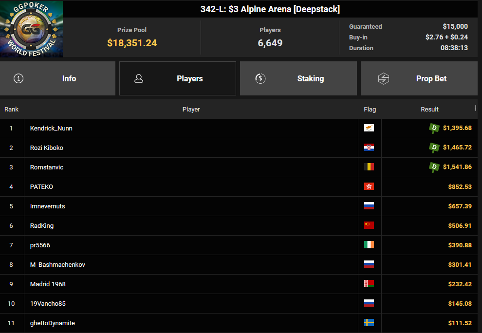 Στην κορυφή του $3 Alpine Arena βρέθηκε τέλος ο “Kendrick_Nunn” για $1.396.