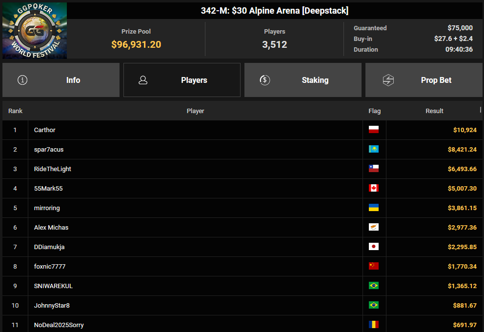 Στην 6η θέση του $30 Alpine Arena αποκλείστηκε ο Αλέξανδρος Μίχας για $2.977.