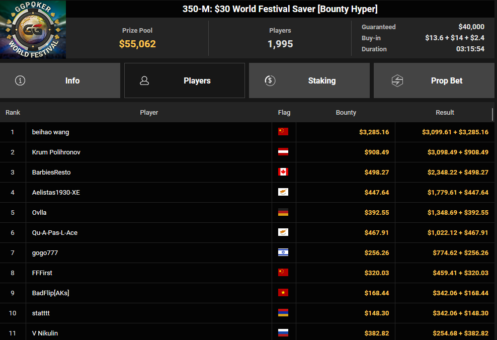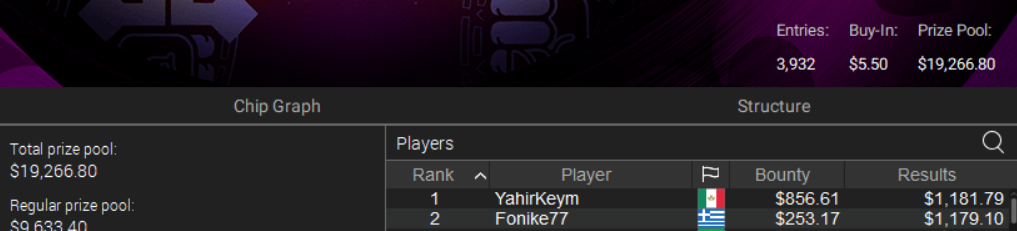 Στο heads-up του $5.5 Bounty Builder ηττήθηκε ο “Fonike77” κερδίζοντας $1.432.