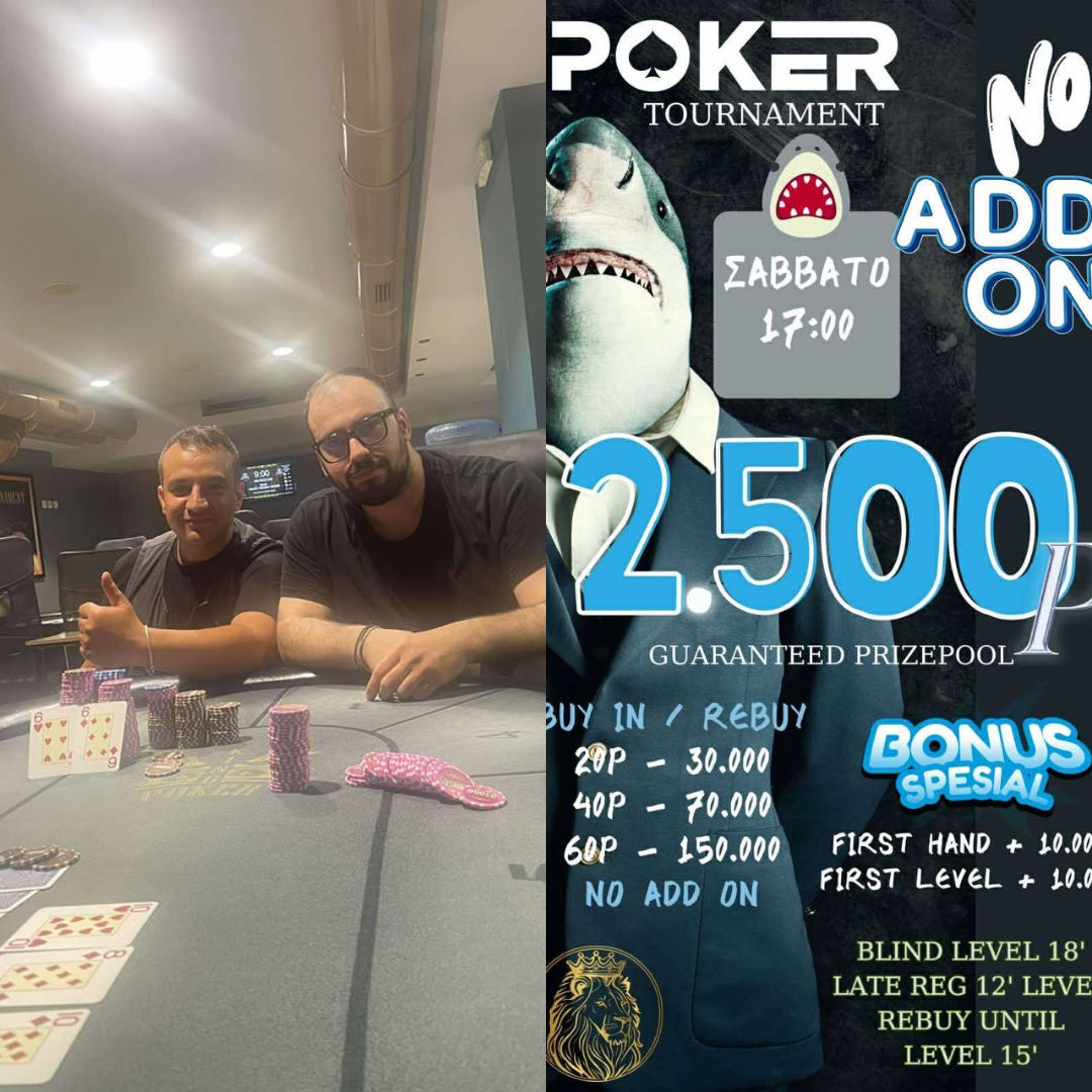 Λίγο νωρίτερα όπως κάθε Σάββατο (17:00) η έναρξη του No Addon που συνοδεύεται και πάλι από 2.500p gtd! Για τους φίλους των ring games φυσικά δεν θα λείπουν και τα Texas/PLO games τις βραδινές ώρες.