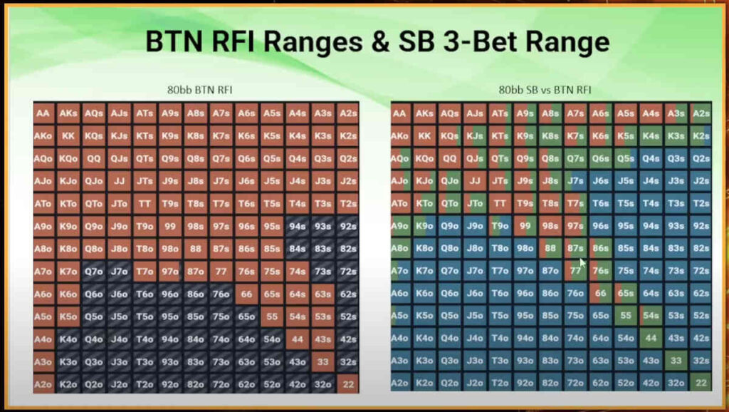 Η παρακάτω εικόνα δείχνει τα βέλτιστα GTO ranges όταν παίζεις από το button και από το small blind, απέναντι σε raise από το button.