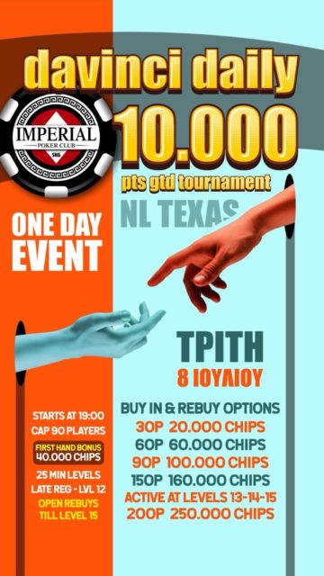 O σύλλογος την Κυριακή θα παραμείνει κλειστός και την ερχόμενη Τρίτη έρχεται το 1-day Davinci Daily με 10.000p gtd!