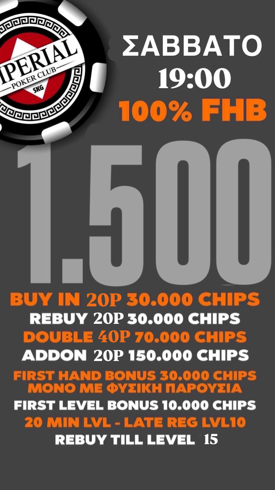 Ιmperial: Σαββατόβραδο με 20p NLHE και 1.500p gtd