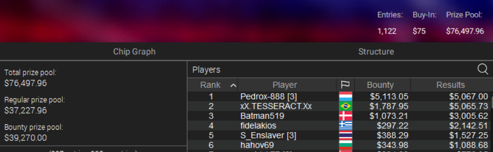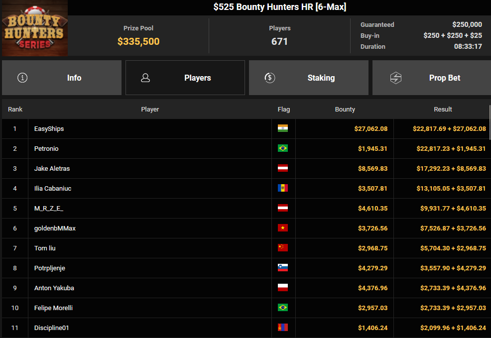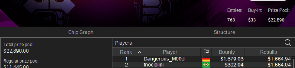 Στην κορυφή του $33 Bounty Builder βρέθηκε εξάλλου ο Δημήτρης “Dangerous_Μ00d” Κουρούς κερδίζοντας $3.344, ενώ μετέδιδε το session του ζωντανά στο Twitch.