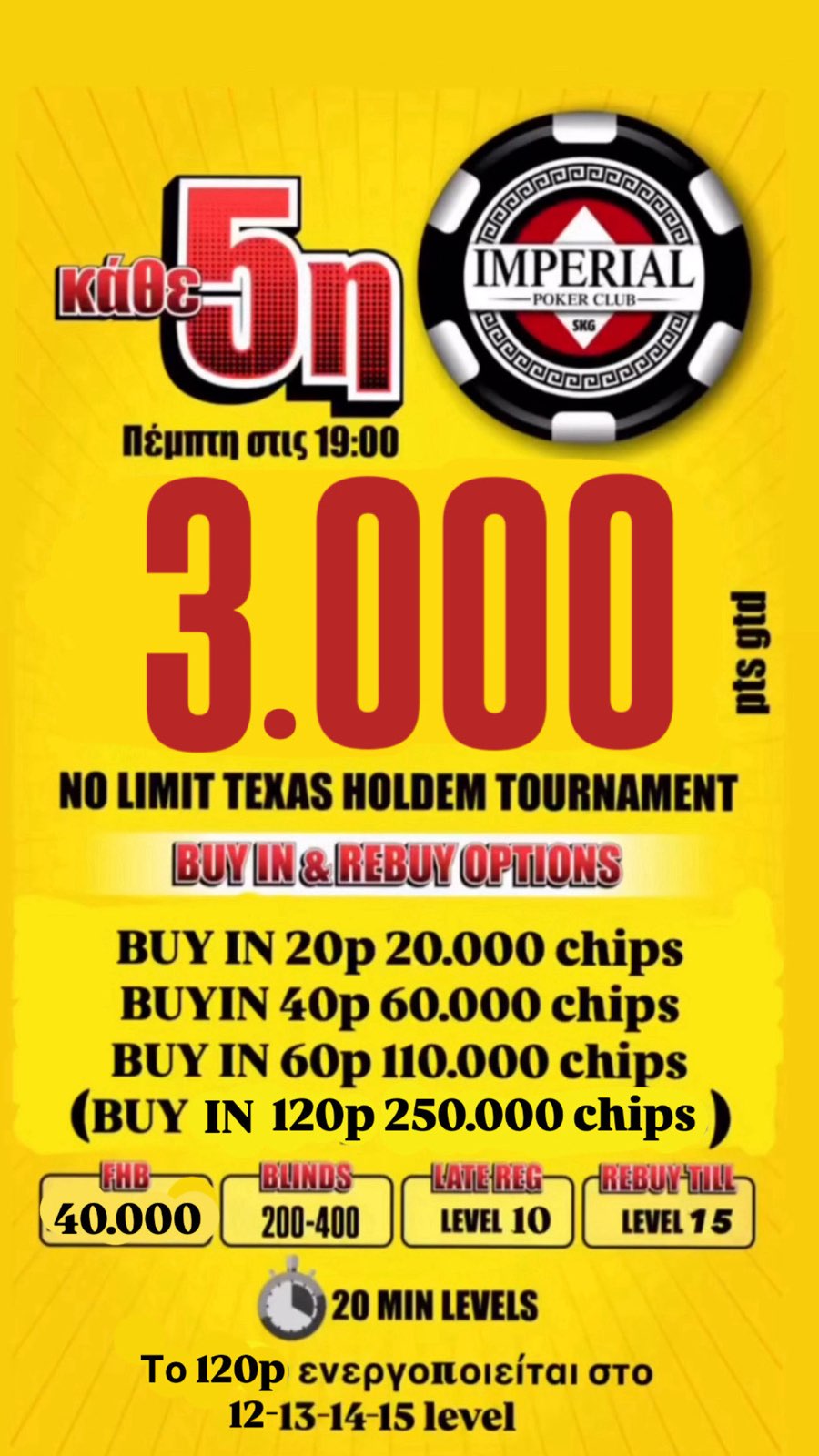 Imperial: Τexas Hold’em event στις 19:00 με 3.000p gtd