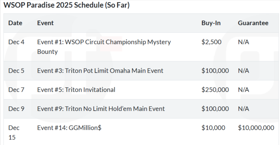 Το WSOP Paradise 2025 έχει προγραμματιστεί να διεξαχθεί από τις 4 έως τις 18 Δεκεμβρίου στο Atlantis Paradise Island. Αν και το πλήρες πρόγραμμα δεν έχει ακόμη ανακοινωθεί, υπάρχουν ήδη μερικά συναρπαστικά στοιχεία που αξίζει να περιμένουμε.