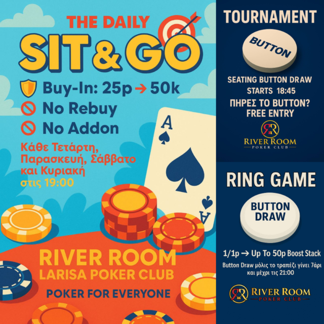 Ο σύλλογος ‘River room poker club’ εδρεύει στην οδό Γρηγοροπούλου 1, δίπλα στα Υπεραστικά Kεντρικά ΚΤΕΛ της Λάρισας.