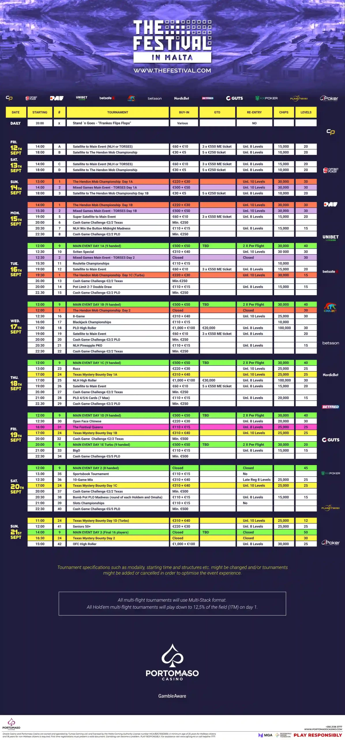 Το πλήρες πρόγραμμα των τουρνουά για το Malta 2025 δεν έχει ακόμη οριστικοποιηθεί, όμως οι παίκτες μπορούν να αναμένουν μια γεμάτη εβδομάδα δράσης. Εκτός από τα κορυφαία events όπως το NLH Main Event, το Hendon Mob Championship και το Mystery Bounty, το The Festival Series Malta θα περιλαμβάνει και τα εξής: