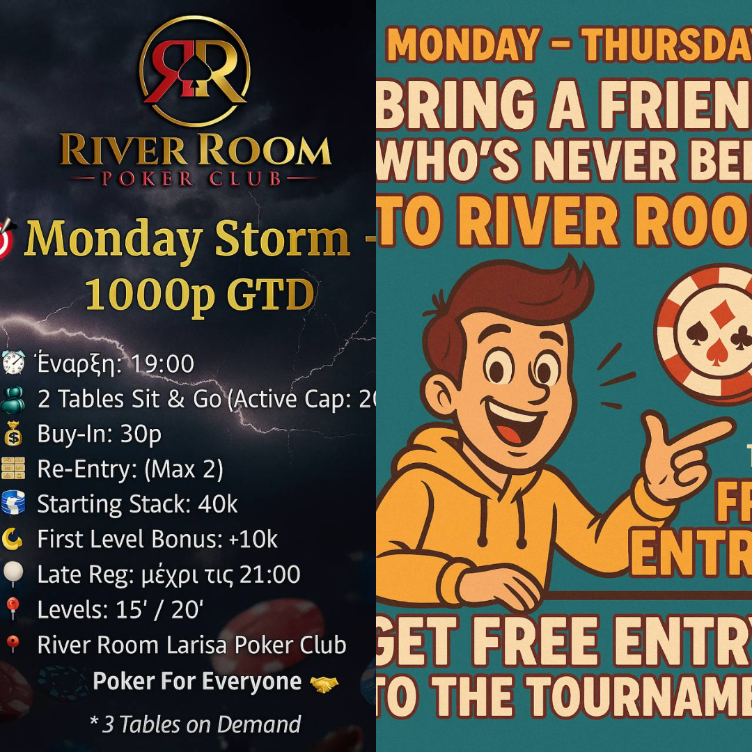 Η εβδομάδα ξεκινάει δυναμικά στο River room poker club της Λάρισας με το Monday Storm (1.000p gtd) στις 19:00 και την καμπάνια 1+1!