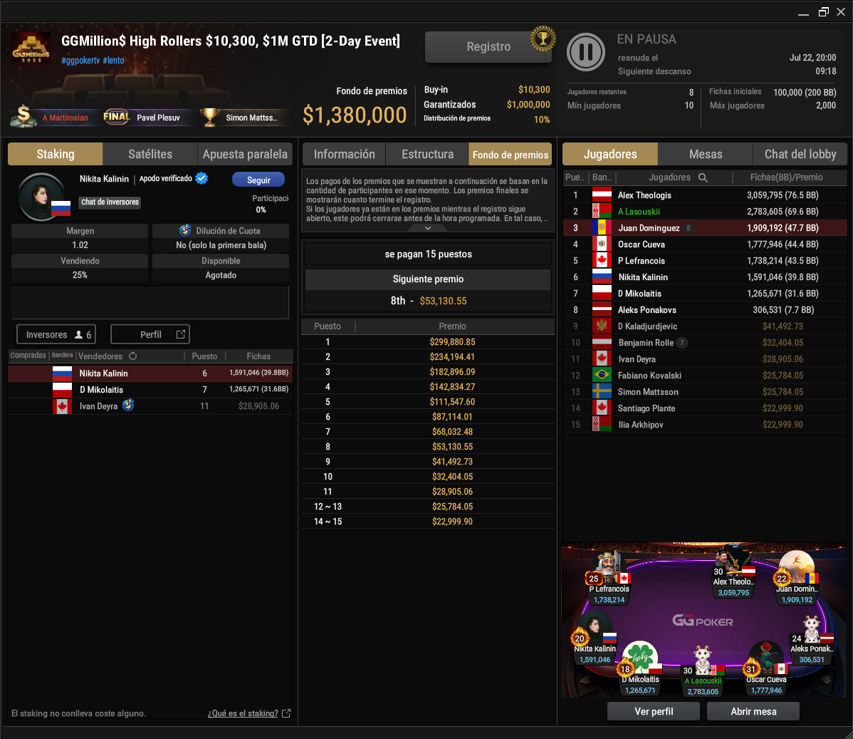 Αυτή την εβδομάδα, το GGMillion$ συγκέντρωσε 138 παίκτες, δημιουργώντας ένα έπαθλο ύψους $1.380.000 – πολύ πάνω από το εγγυημένο ποσό του $1 εκατομμυρίου. Μόνο 15 παίκτες κατάφεραν να μπουν στα χρηματικά έπαθλα και, μετά από περισσότερες από οκτώ ώρες μάχης, έχουν απομείνει μόνο οκτώ φιναλίστ.