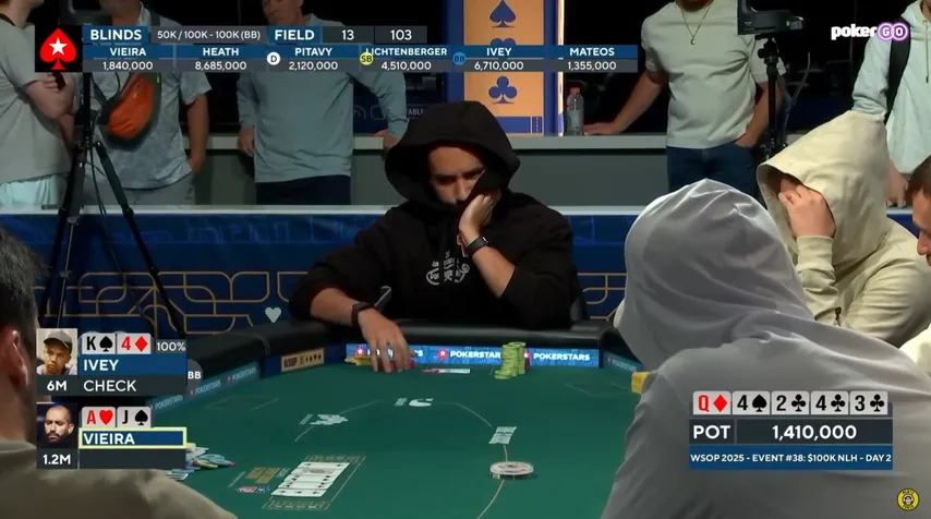 Αυτό είναι Q-4-2, και όταν ο Ivey κάνει ξανά donk bet, ο Joao θα κάνει call με πολλά χέρια. Το SPR τώρα είναι κάτω από το ένα για τον Πορτογάλο επαγγελματία – μια κρίσιμη λεπτομέρεια.