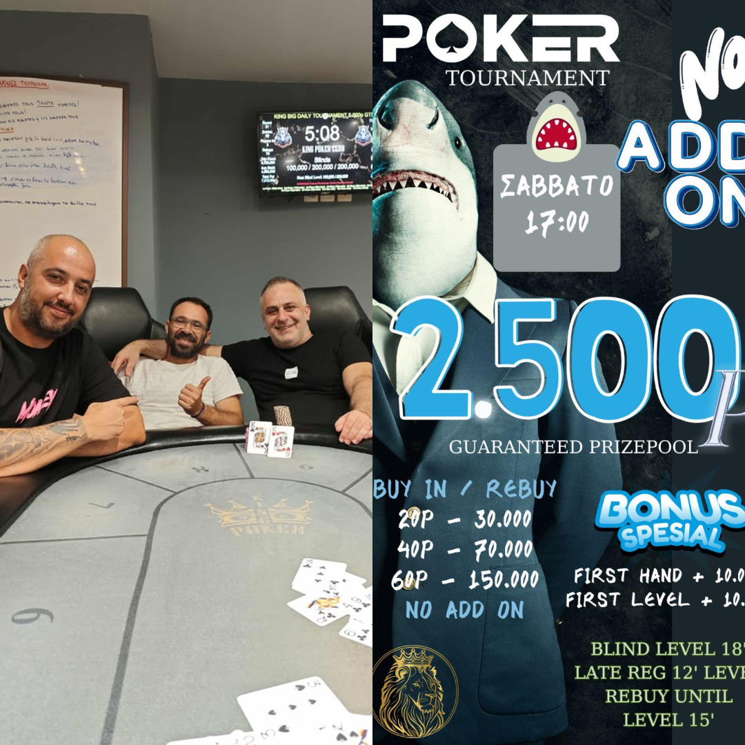 Λίγο νωρίτερα όπως κάθε Σάββατο (17:00) η έναρξη του No Addon που συνοδεύεται και πάλι από 2.500p gtd! Για τους φίλους των ring games φυσικά δεν θα λείπουν και τα Texas/PLO games τις βραδινές ώρες.