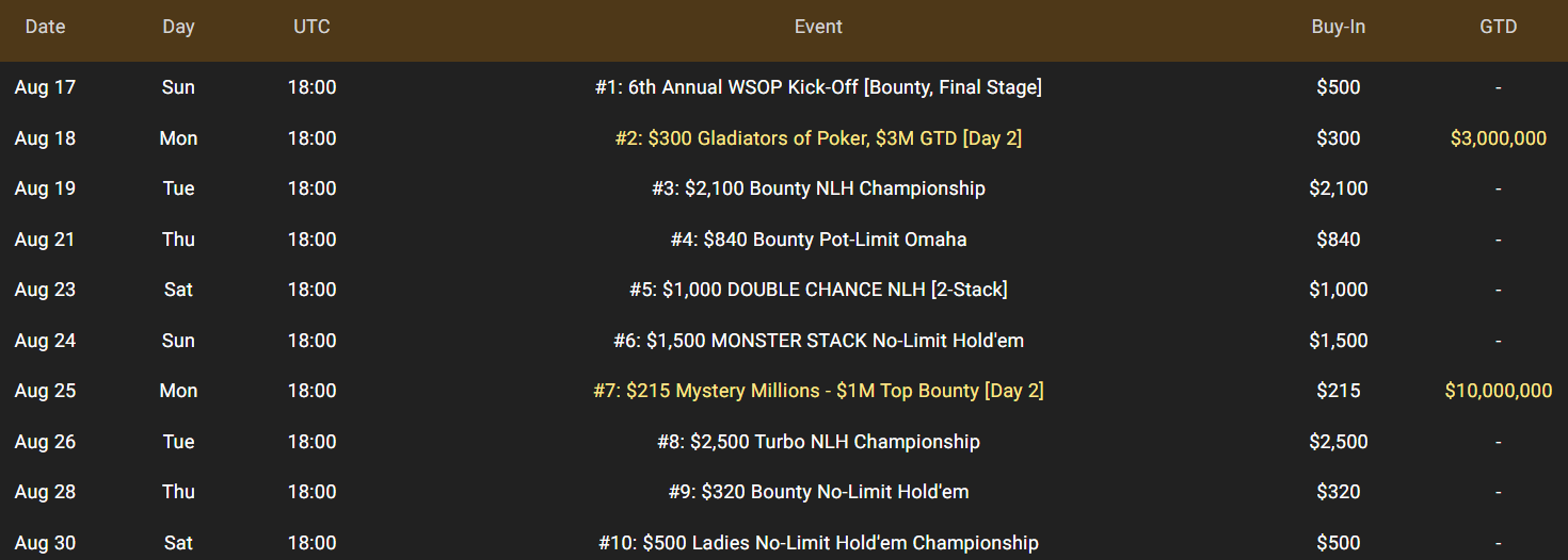 Το φεστιβάλ των έξι εβδομάδων θα διεξαχθεί από τις 17 Αυγούστου έως τις 30 Σεπτεμβρίου, περιλαμβάνοντας 33 επίσημα events WSOP Gold Bracelet, δεκάδες εκατομμύρια σε εγγυημένα έπαθλα και ένα τεράστιο ποσό $5.000.000 σε ειδικές προσφορές, σχεδιασμένες για να ανταμείψουν παίκτες σε όλο τον κόσμο.
