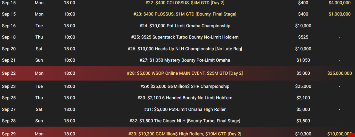 • 22 Σεπτεμβρίου: $5.000 WSOP Online main event – Mε $25.000.000gtd