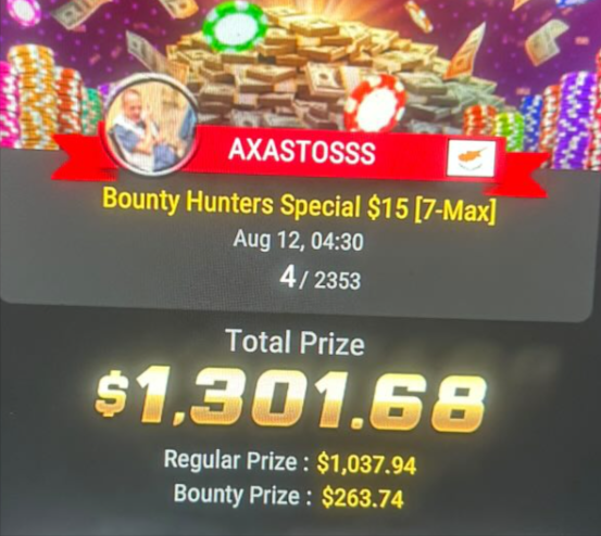 Τέλος ο “AXASTOSSS” τερμάτισε στην 4η θέση του $15 Bounty Hunters για $1.302.